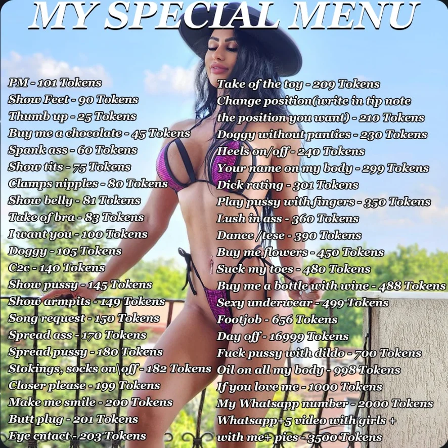 Раком, Тверкинг, Верблюжья лапка, Поза наездницы, Шлепки, Курение, Стриптиз, Топлесс, Под юбкой, Каблуки, Ахэгао, Эротические танцы, Шоу с маслом, Засвет, Глубокая глотка, Дилдо или вибратор, Минет, Между грудей, Секс-игрушки, Ролевые игры, Оргазм, Мастурбация, Грязные разговоры, Мастурбация пальцами, Дрочка рукой, Рейтинг члена, Сквирт, Жёсткий секс, Рогоносцы, Фут-фетиш, Унижение, Инструкция по дрочке, Латекс, Кожа, Госпожи, Игрушки для сосков, Нейлон